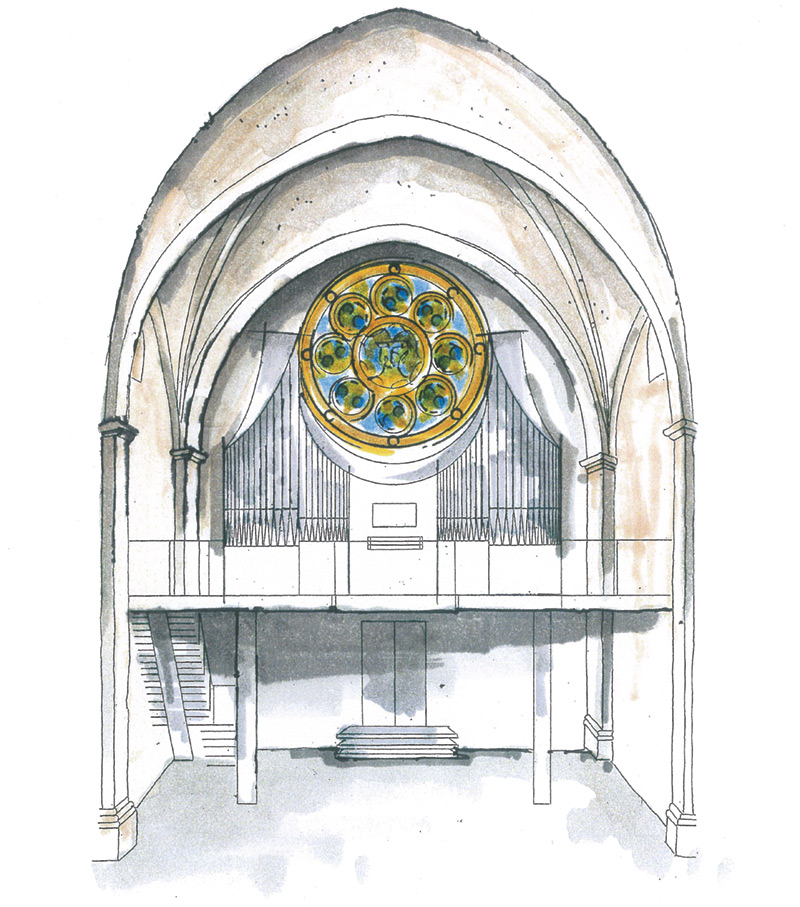 Die neue Orgel wird auf der Westempore, von außen optisch kleiner wirkend als bisher, um die Rosette angelegt. Die Rosette soll somit frei sichtbar werden. Die Empore wird auf das absolute Minimum zurückgebaut, sodass die Westseite wieder zugehörig zum Raum wirken kann.